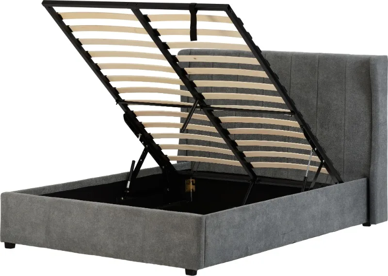Upholstered in grey fabric this contemporary design boasts the popular under bed storage, with this lift up mechanism. This gives access to lots of space underneath the bed.
