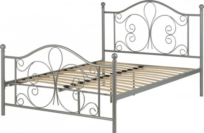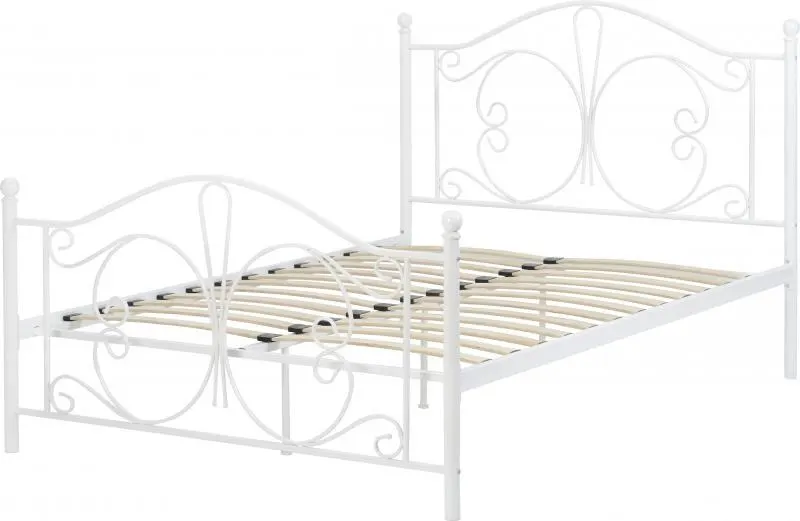 White ornate metal bed frame with laminated sprung slats.