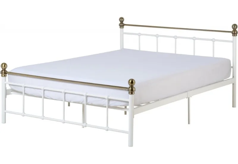 A traditionally styled white metal bed frame with brass finials and top rails. With sprung slats. Charming brass finials and top rails, add a touch of elegance to this super priced bed frame.