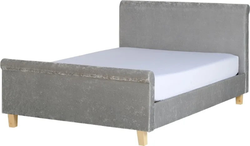 Ornate, grey crushed velvet bedframe, upholstered in elegant grey crushed velvet. Sprung slats.